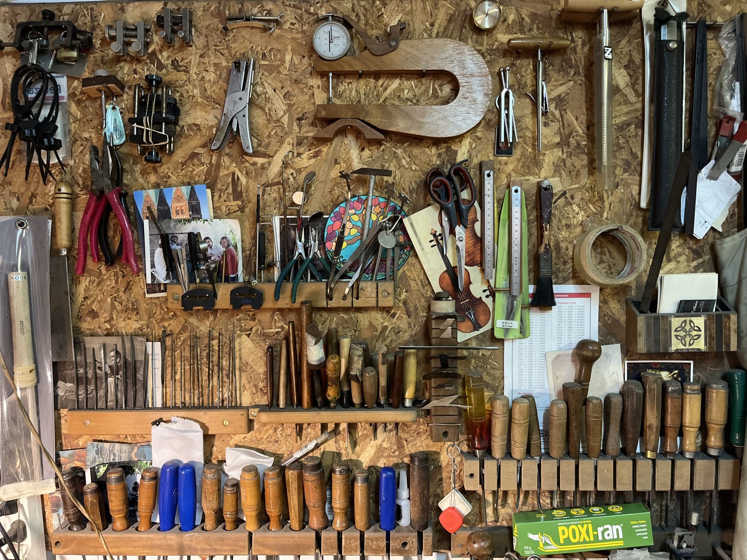 His studio was perfect. An array of worn tools clung jauntily to the walls, ordered, yet with the carefree swing of things happily used, things that lived daily in the service of purpose. The larger machines were secured in the corners, and a faint film of sawdust blanketed the workbench. A large, unruly brush lay patiently, waiting for its task. From the low ceiling hung a row of exquisite violins, of all sizes, suspended with delicate confidence.