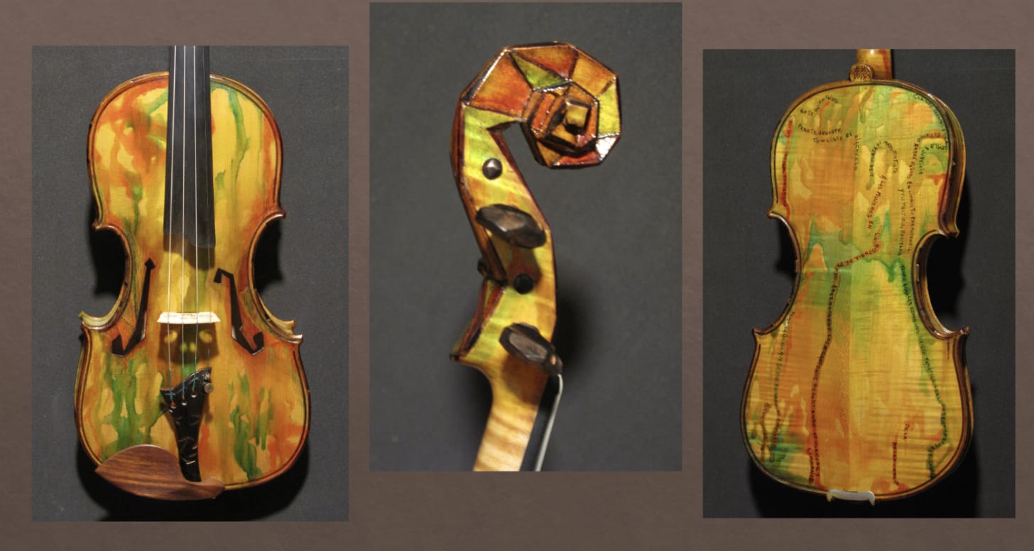 Then our dear luthier told us about another violin he had worked on... one that was quite different. In what could only be described as a radical departure from five hundred years of tradition, he created a violin without symmetry. The neck bent to the left, the lower bout jutted out, the tailpiece curved and the bridge twisted.