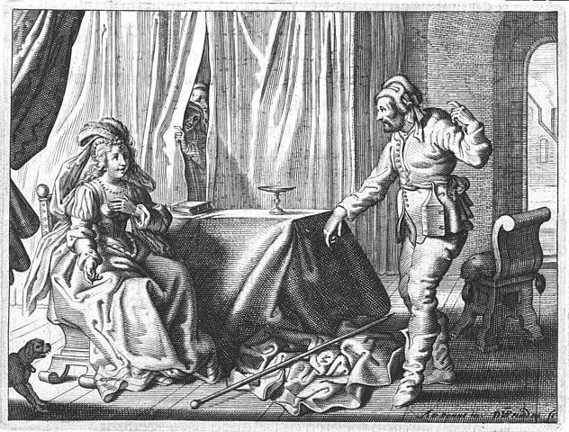 Engraving of Hipparchia and Crates from Jacob Cats’ Touchstone of the Wedding Ring. The picture shows Crates, dressed in 17th-century clothing, attempting to dissuade Hipparchia from her affections by showing her how unattractive he is
