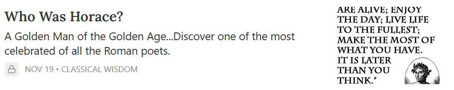 This week here at Classical Wisdom, Members got a look at the life of Horace, the poet who wrote that famous phrase, carpe diem.